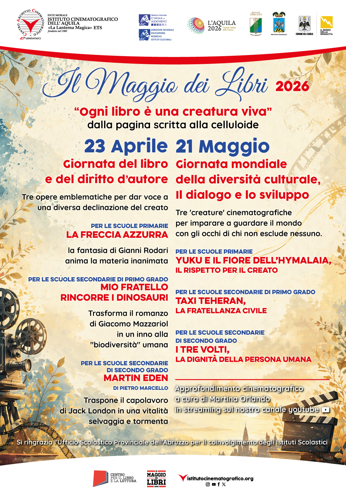 In occasione del Maggio dei Libri 2026, l’Istituto Cinematografico dell’Aquila “La Lanterna Magica” ETS promuove un percorso educativo speciale rivolto alle scuole di ogni ordine e grado. Quest’anno, l’iniziativa si inserisce in un contesto culturale di eccezionale rilievo: le celebrazioni per l’ottavo centenario del “Cantico delle Creature” di San Francesco d’Assisi. Ispirandoci allo slogan nazionale “Ogni libro è una creatura”, abbiamo strutturato una proposta che intreccia la Giornata mondiale del libro e del diritto d’autore (23 aprile) con la Giornata mondiale della diversità culturale per il dialogo e lo sviluppo (21 maggio): “Ogni libro è una creatura viva, dalla pagina scritta alla celluloide”.