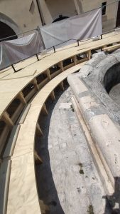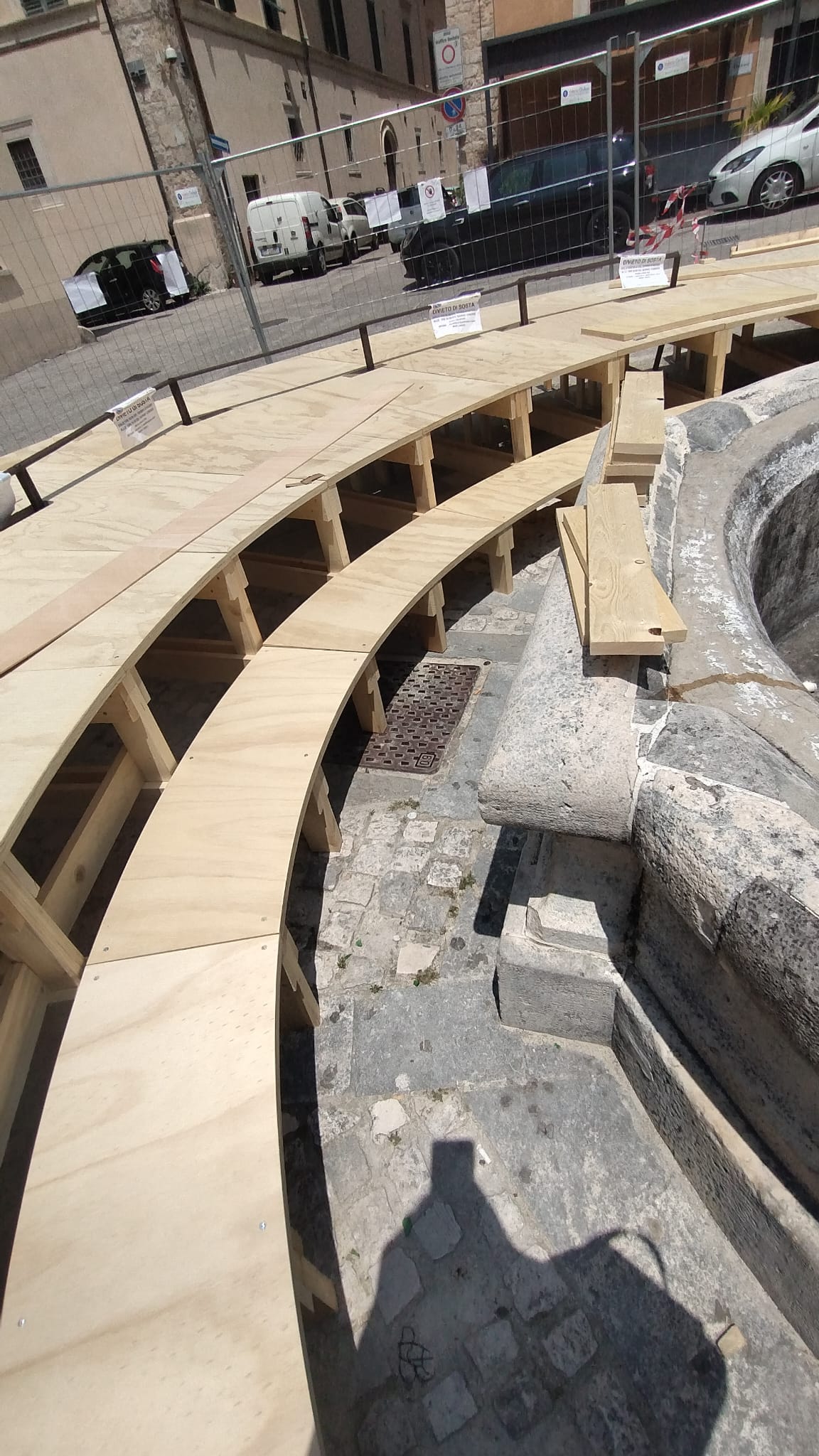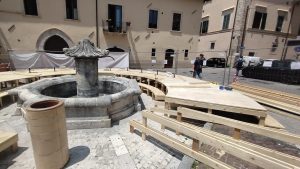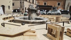 Il progetto prevede la realizzazione di una struttura temporanea a forma circolare in legno che abbraccia la fontana e appoggia sula pavimentazione originale in sanpietrino bianco. Si prevede la riattivazione della fontana e l’inserimento di tre alberi in vaso per aumentare la qualità dello spazio durante i mesi estivi, rendendo l’area della fontana più accogliente.