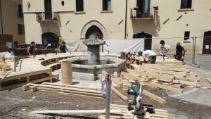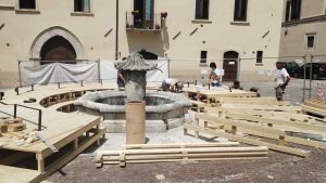 L’installazione INTORNO è volta a qualificare l’area circostante la fontana di Piazza Santa Maria Paganica attraverso un laboratorio di autocostruzione con gli studenti di Ingegneria Edile, Architettura dell’Università degli Studi dell’Aquila e volontari selezionati attraverso una call aperta.