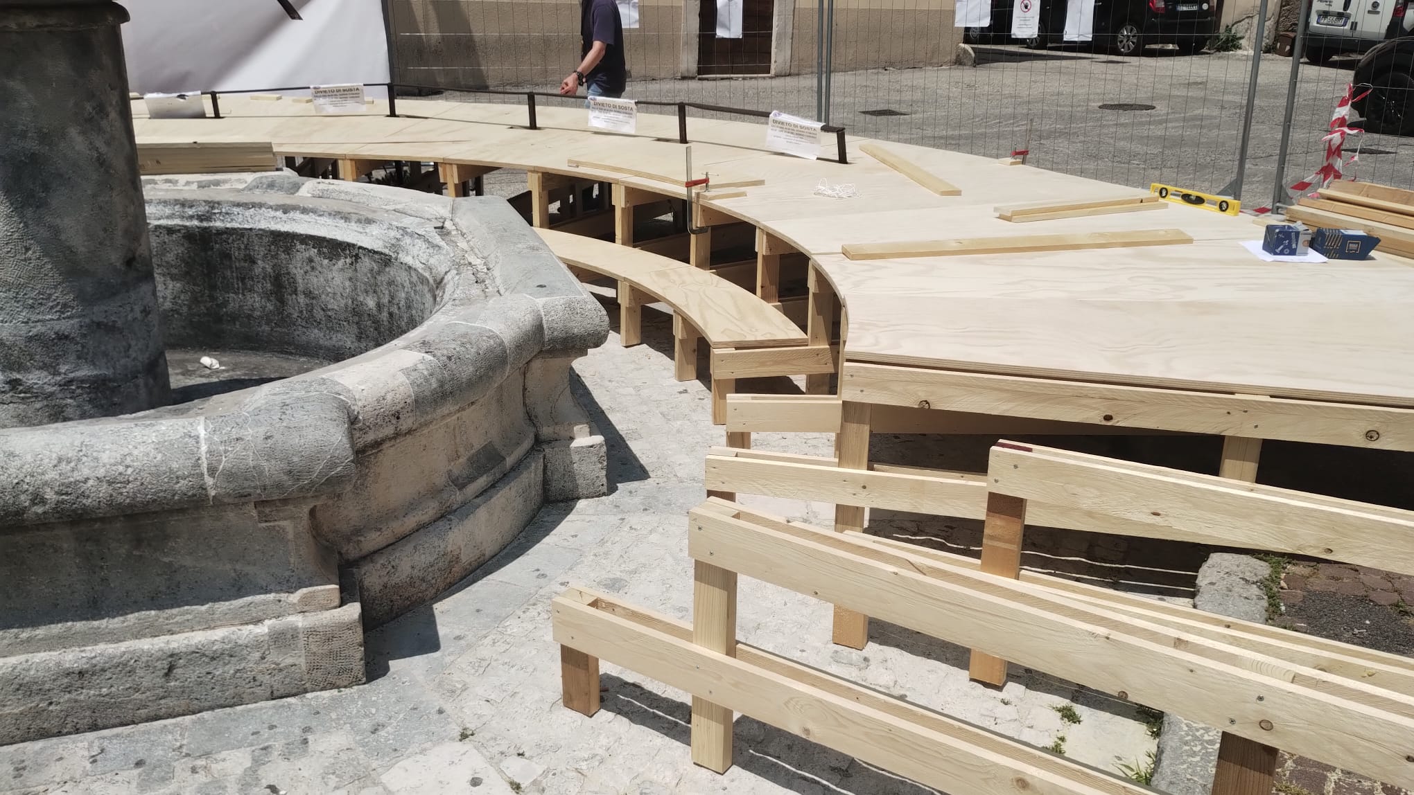 La struttura in legno circolare, con una larghezza di 2,7 metri, sarà posizionata a circa 55 cm dalla fontana e si svilupperà su due livelli. L’installazione sarà dotata di una rampa per garantire la completa accessibilità. I parapetti in ferro esistenti saranno integrati nella struttura e protetti dalle sedute in legno.